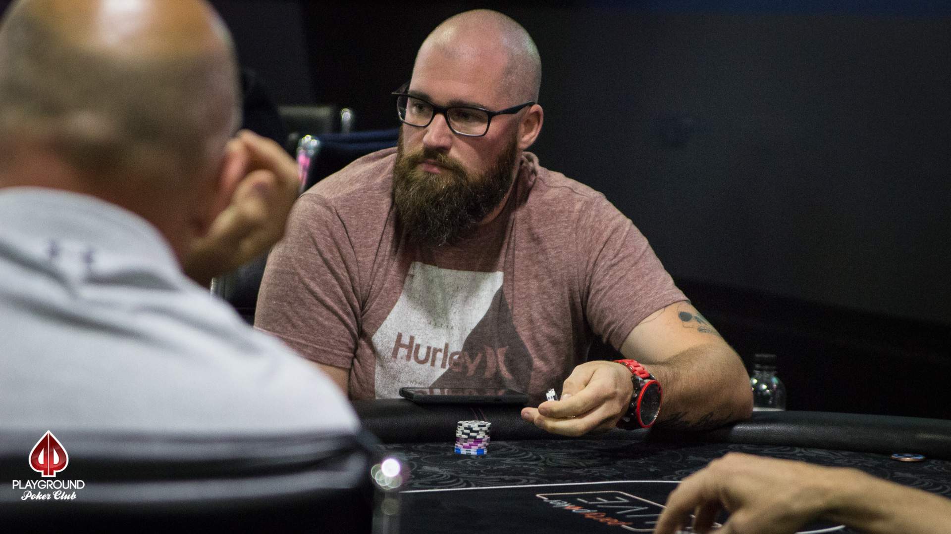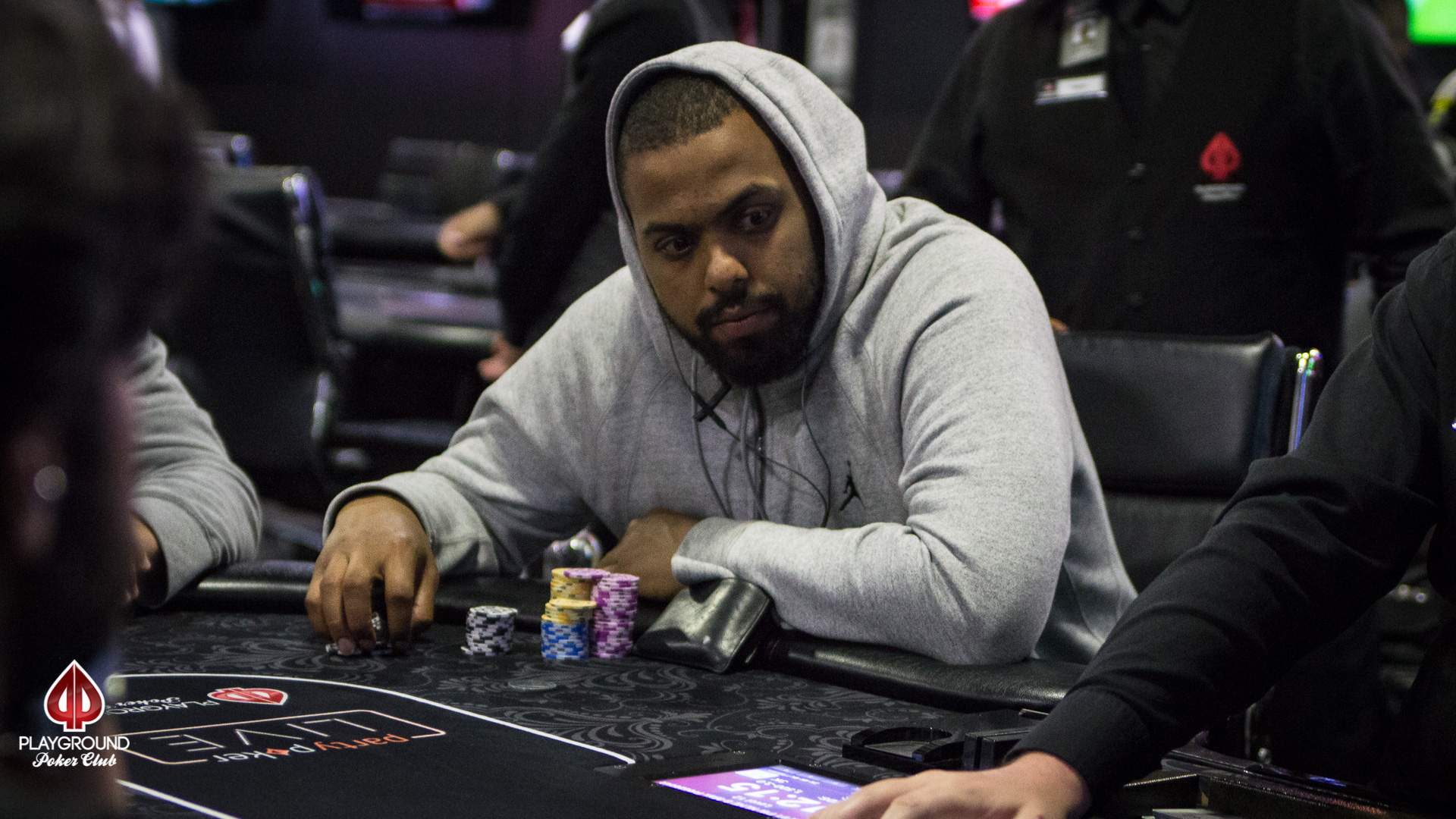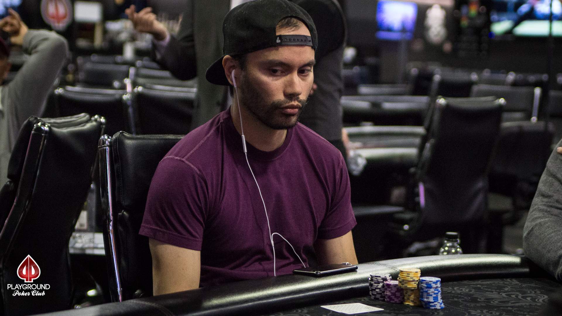 The fateful hand began with a raise to 20,000 from Brent McCue in early position, which was followed up by Justin Colicchio’s all-in for less than that from the dealer button. Raphael Tran Dinh called from the bb and they were three way to the flop with about 55K in the main pot and a small side pot – but a side pot that could grow.