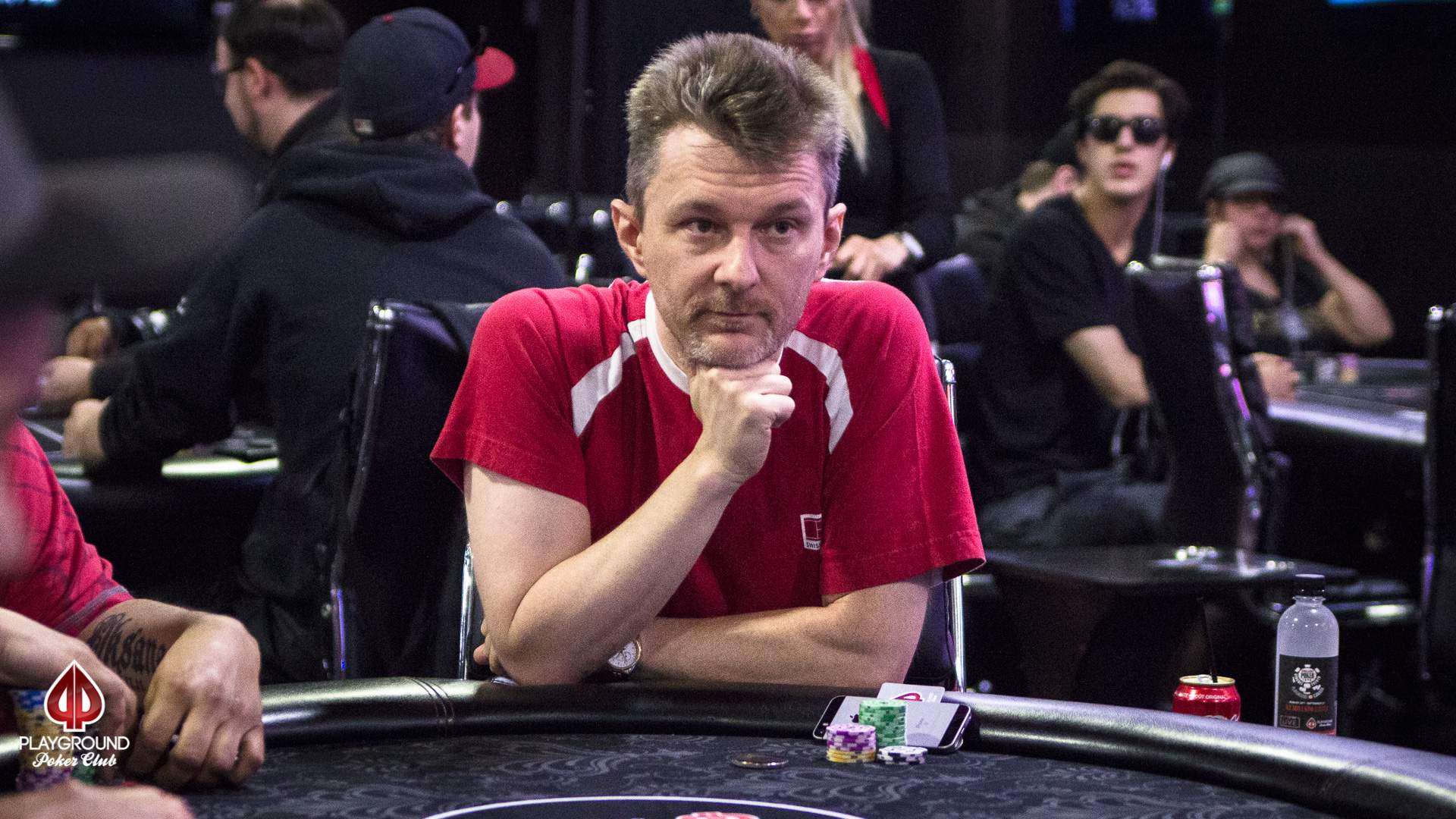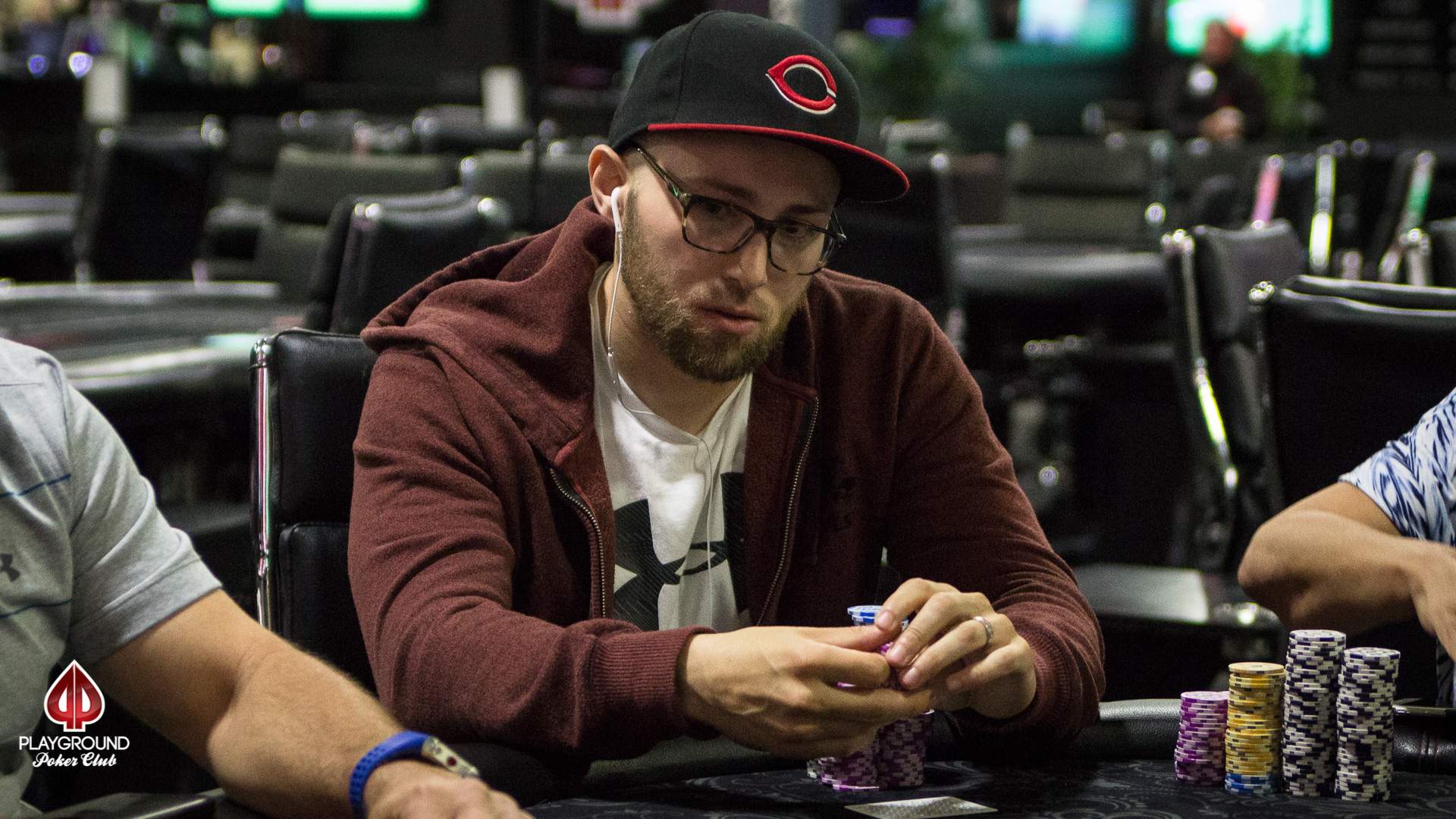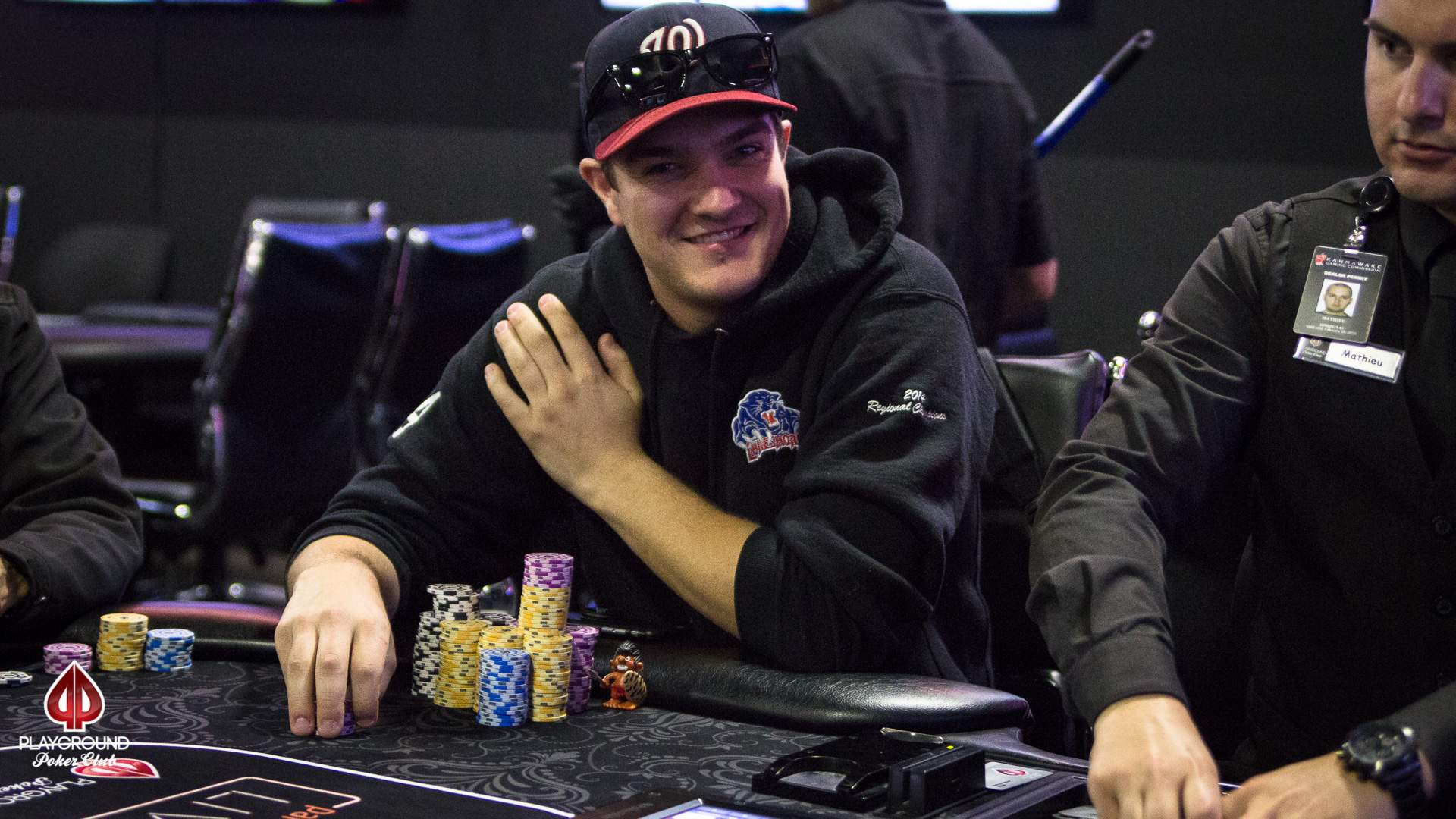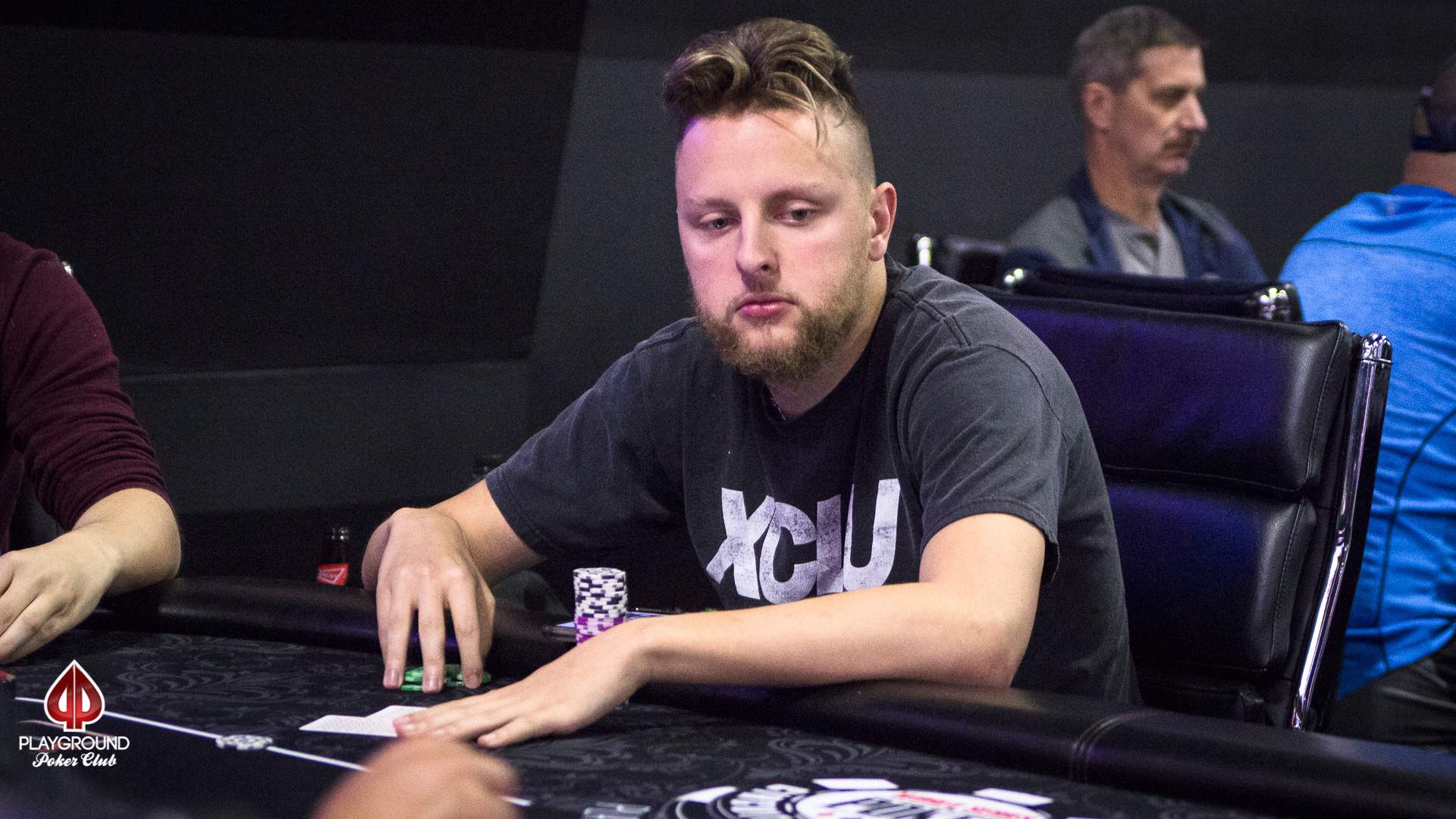 The fateful hand began with a raise to 20,000 from Brent McCue in early position, which was followed up by Justin Colicchio’s all-in for less than that from the dealer button. Raphael Tran Dinh called from the bb and they were three way to the flop with about 55K in the main pot and a small side pot – but a side pot that could grow.