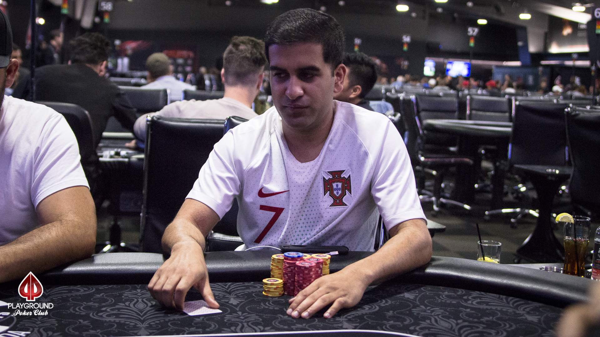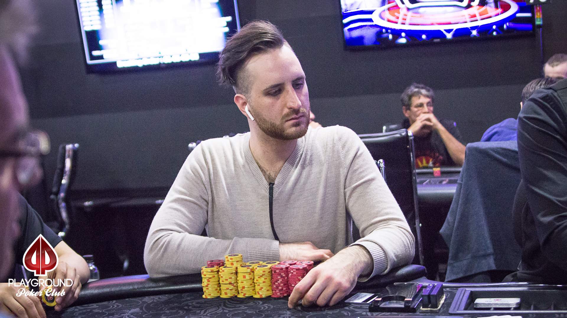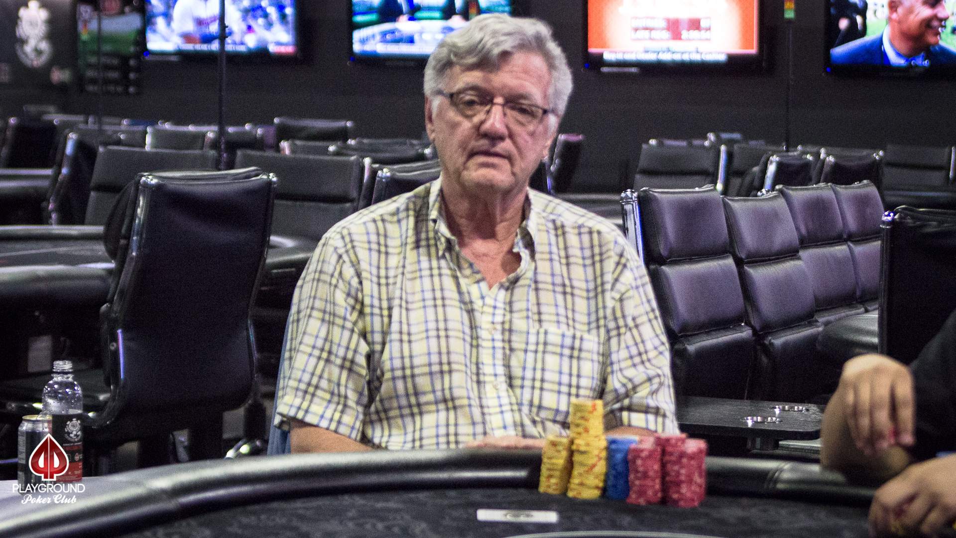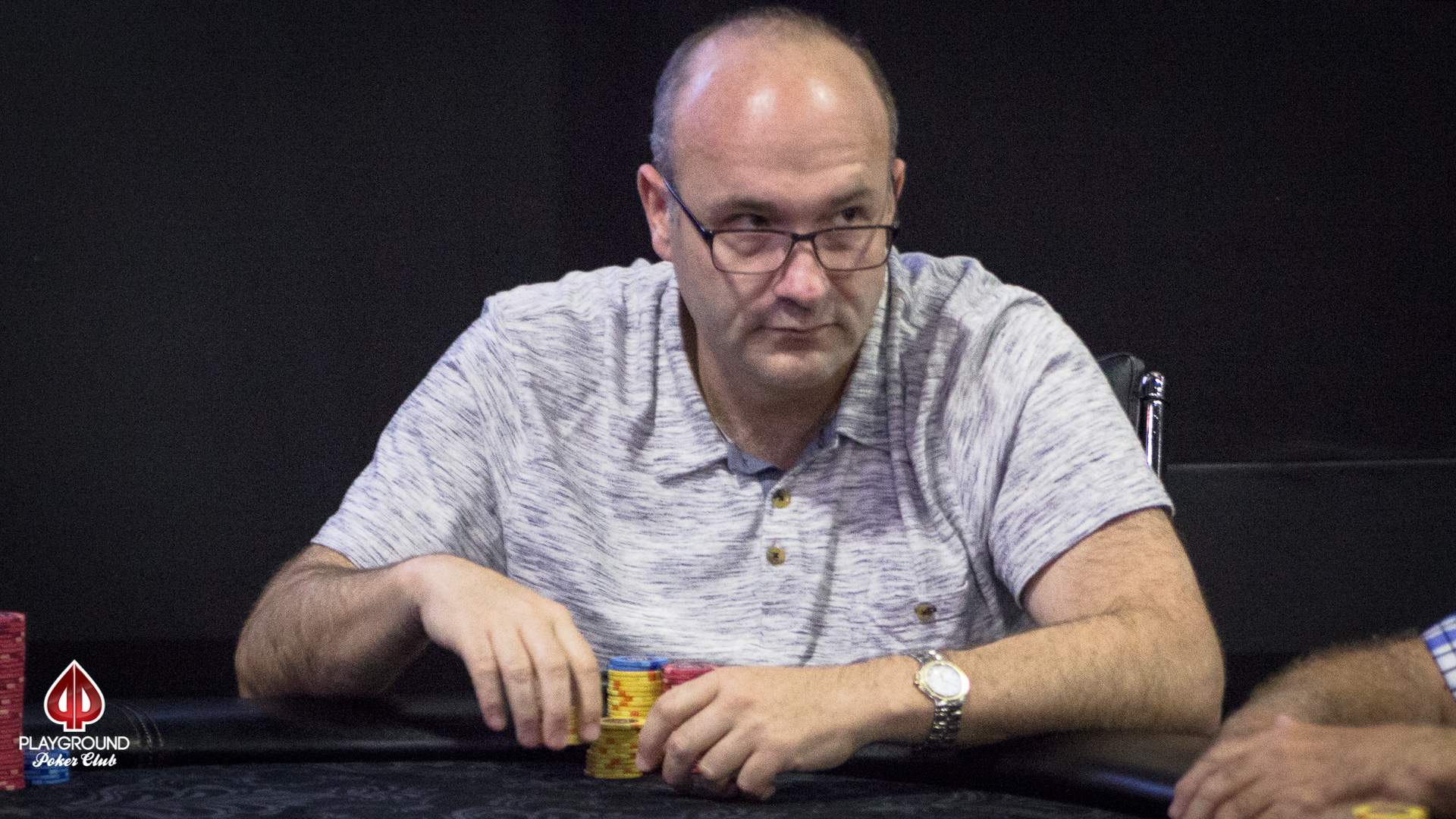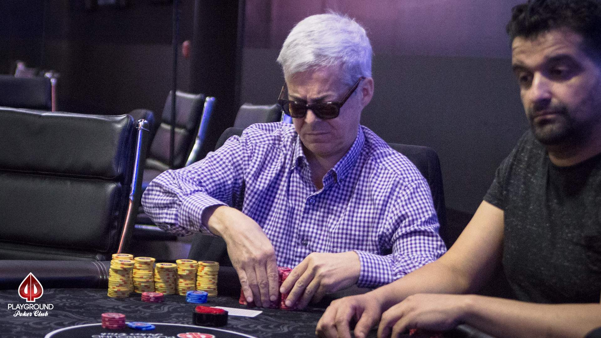 Although players continue to be eliminated, in one sense the tournament went “backwards” in the last stint of 3 levels. Whereas there were 3 players with over 1M in chips at that time, now there are only two – Michel Gariepy (1,653,000) and Robert Courriere (1,423,000).